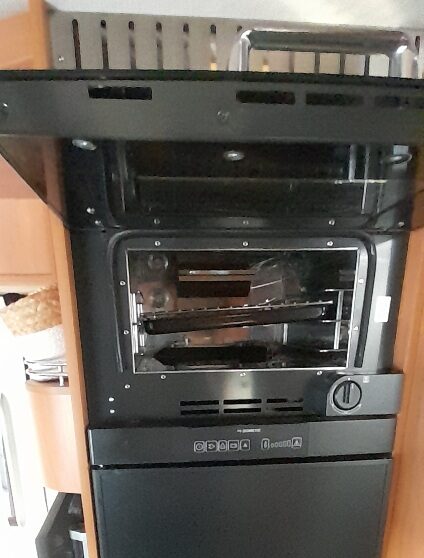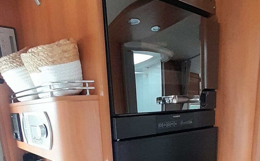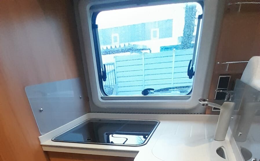 De royale hoekkeuken heeft een luxe keukenblad met spoelbak en 3 pits kooktoestel met automatische ontsteking, diverse gelagerde laden met verrassend veel bergruimte voor het kookgerei en boodschappen, grote Dometic koelkast met ruim vriesvak, luxe gasoven en automatische energiekeuze.