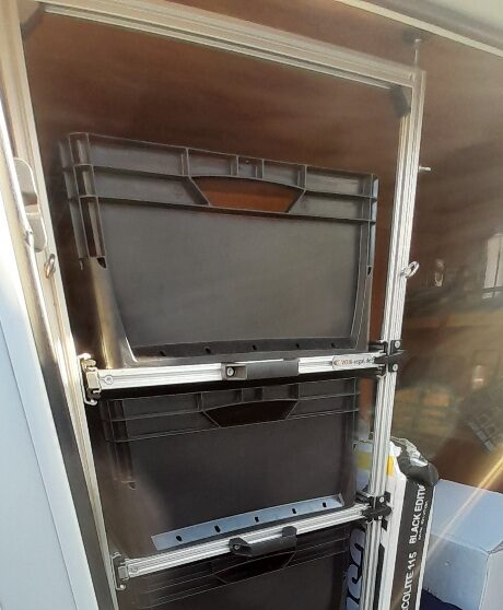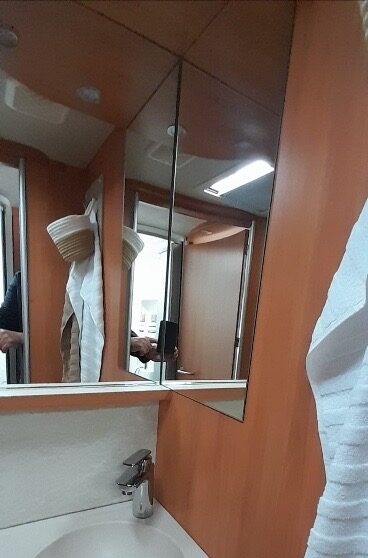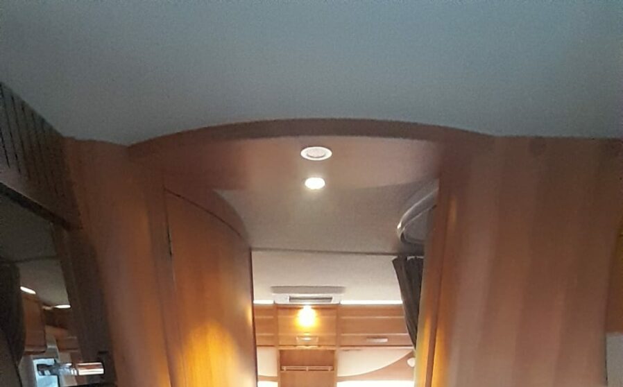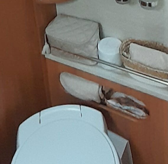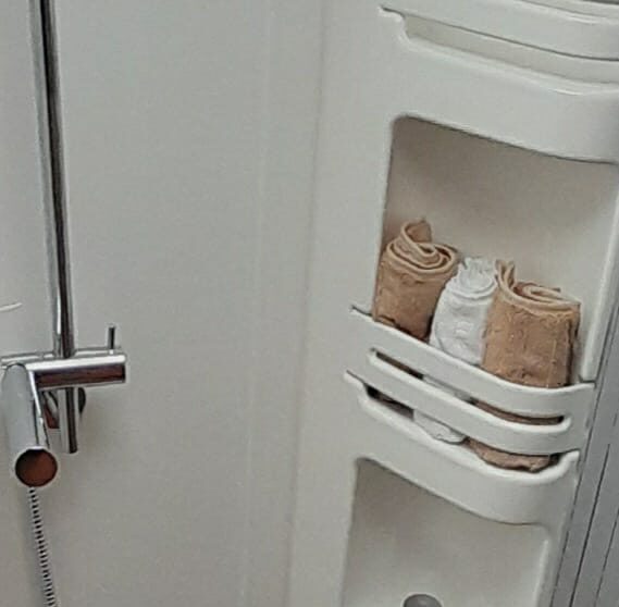 Links achterin bevind zich de ruime douchecabine, en er tegenover het toilet Thetford met SOG automatische toilet ontluchting en extra kastruimte. De schoonwatertank en vuilwatertank zijn geïsoleerd en verwarmbaar in de vloer weggewerkt.