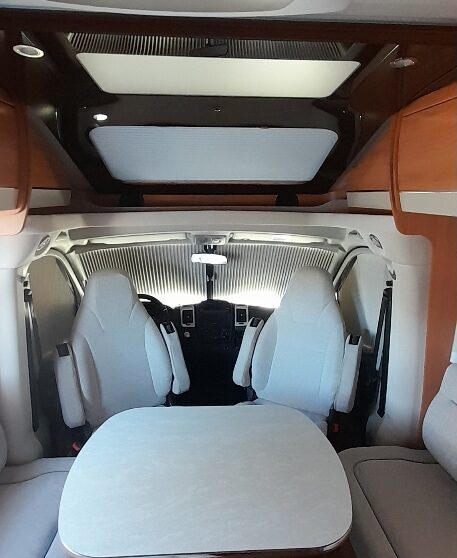 2 comfortabele pilotestoelen draaibaar naar gezellige en comfortabele zitgroep, met lange zijbank en een groot panoramadakluik erboven. Het interieur bestaat uit de Hymer woonruimte-concept Trentino birnbaum in combinatie met chique Tabago leder/stofbekleding. De vele LED verlichting maakt de sfeer compleet. Het betreft een SL serie met een volledig vlakke vloer en veel bergruimte bereikbaar via luiken in de vloer. Alle ramen zijn voorzien van plissévouwverduistering.
